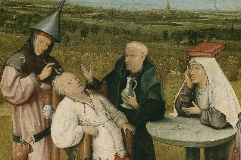 Il chirurgo intento all’operazione indossa però un copricapo a forma di imbuto, simbolo di stupidità: è una critica di Bosch contro chi crede di sapere ma che, alla fine, è più ignorante del paziente a cui deve togliere la «follia».